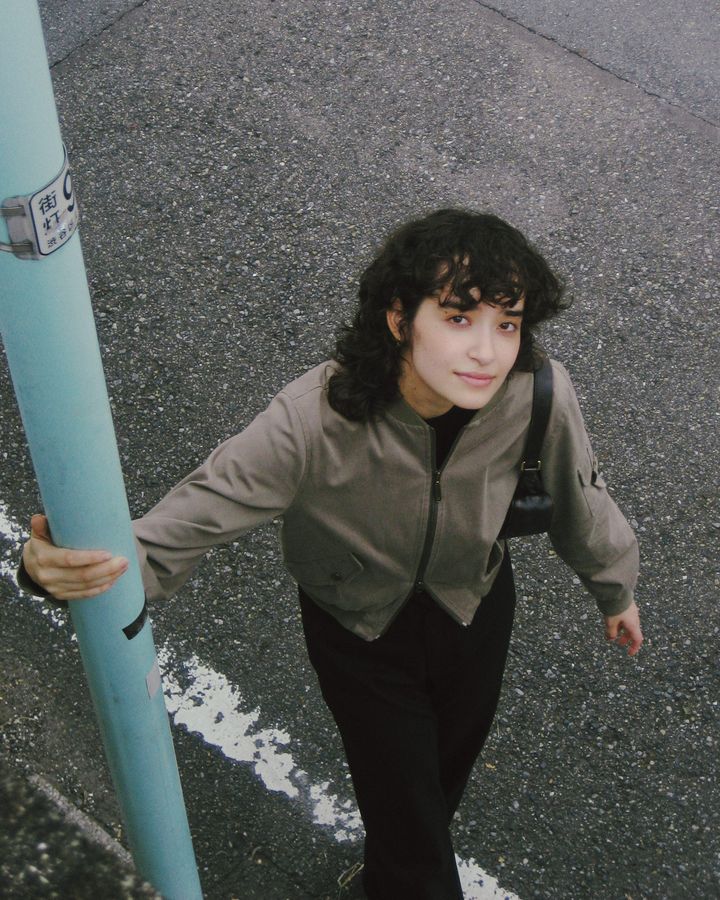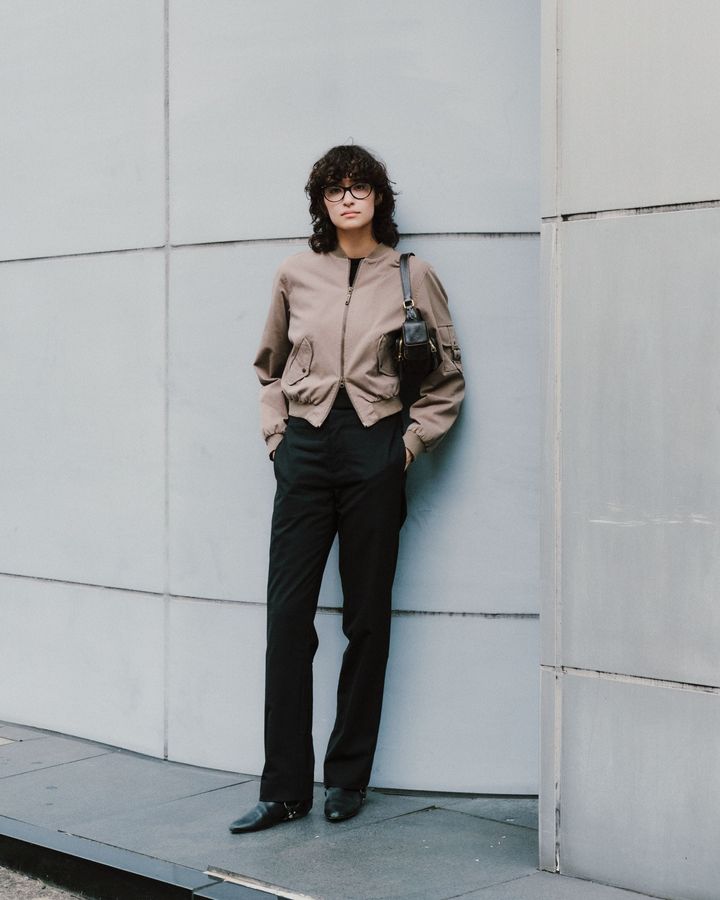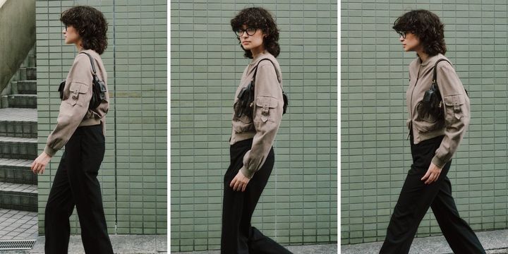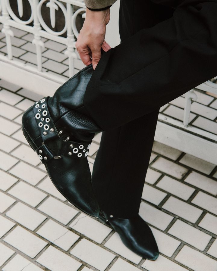 自分のボディラインに合ったシルエットや、細かいサイジングに気を付けてスタイリングを組みました。ジャケットはイタリア製のヴィンテージ、ニットは「ロベルト コリーナ」 、パンツはスタイリストの猪塚さんが手掛けている「スパイシー」です。小物もお気に入りのアイテムを詰め込みました。シューズは「ルイ・ヴィトン」、バッグは「ミュウミュウ」、ピアスは「トムウッド」、メガネは「ポリス」です。