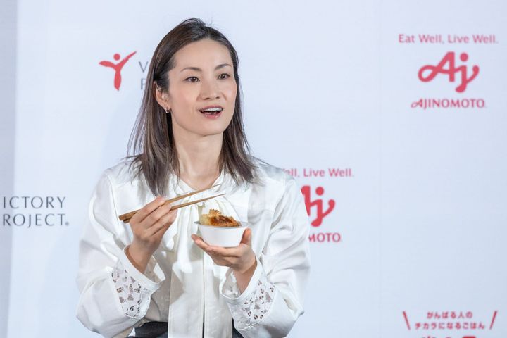 運ばれてくるなり「食欲をそそる、いいにおい!」と笑顔を見せた荒川さん。「しっかり日本の風味でホッとします。私が現役だった20年前は日本食は貴重でした。サポートの進化がすごいですね」と、野菜もタンパク質もワンボウルでおいしく摂れるメニューの完成度に驚き、後輩アスリートたちへの心強いサポートにも太鼓判を押した。