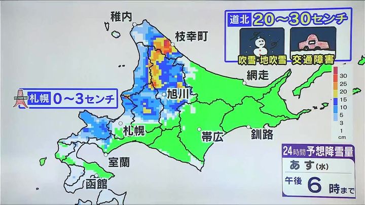 これからあす午後6時までの24時間に、宗谷南部の枝幸町や上川北部など道北の多いところで20~30センチです。