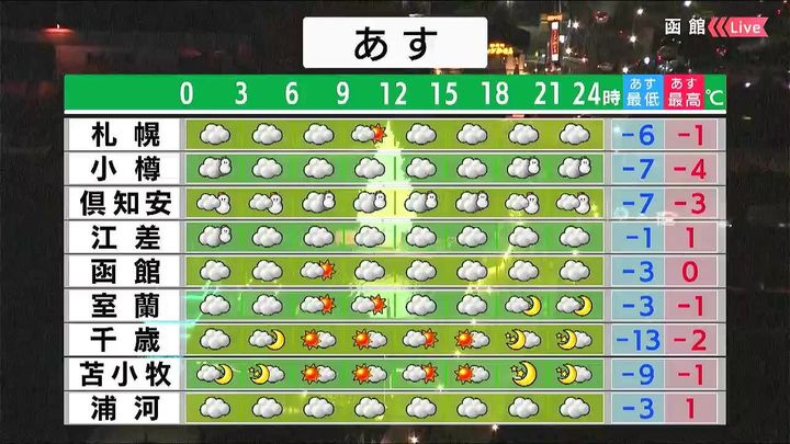 札幌や函館、浦河は雲に覆われ、倶知安は雪が降りやすいでしょう。千歳や苫小牧は晴れる見込みです。ダウンジャケットなど真冬の防寒をして、ツルツル路面にも注意が必要です。