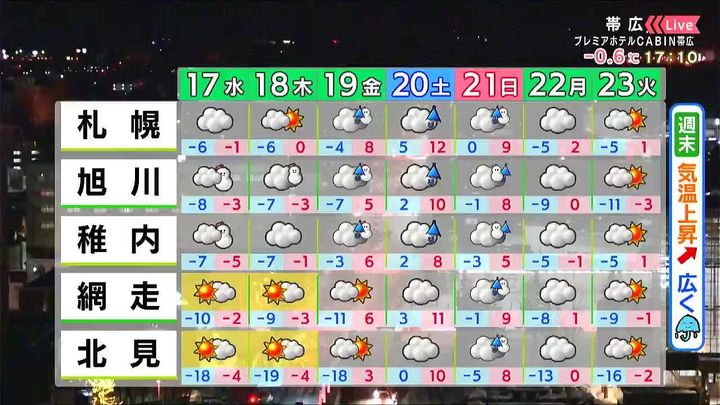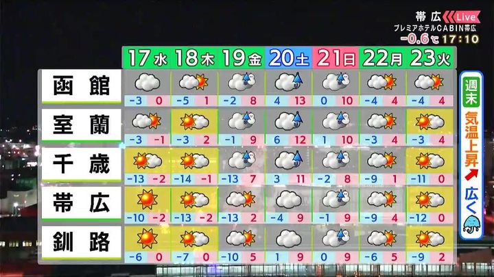 北海道のあす17日(水)の天気と、週間予報を、HBCウェザーセンターの児玉晃(こだま・あきら)気象予報士がお伝えします。