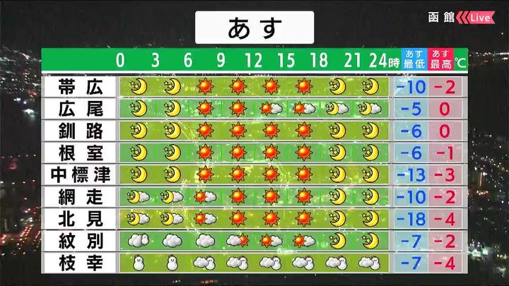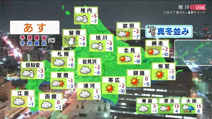 日本海側は雪が降りますが、東部は晴れるでしょう。最低気温は札幌で−6度、北見は−18度です。最高気温は−2度前後で、真冬並みの寒さでしょう。