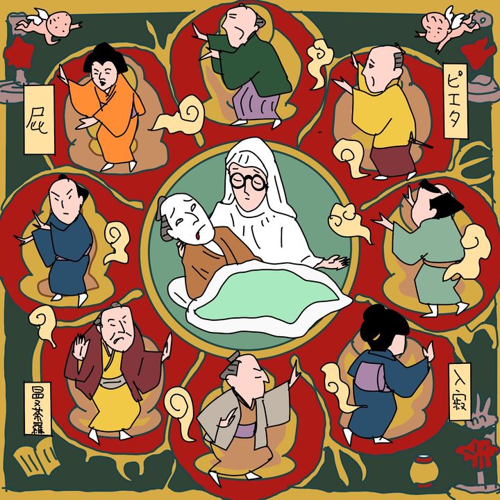 そして最期、2大偉大な死に方パターンの「抱きかかえられるキリストのピエタ」と「人々に囲まれる釈迦の入寂図」の二つをあわせて「屁」を足したような往生。かつて春町先生が書いた「屁に囲まれた屍の図」がついに完成した見事な最期だったね。