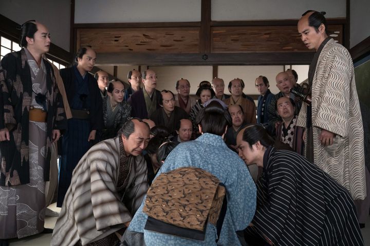 絵師も戯作者も狂歌師も、忘八連中も、本屋仲間も、店の者も。おやじさまも義兄さんも、おていが抱きかかえる蔦重のもとに集まった 写真提供=NHK