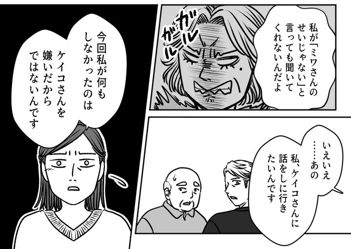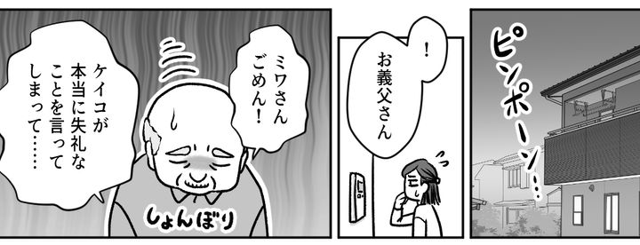 今後についてダイキと話していると、義父がわが家にやってきました。ケイコさんとお子さんが少し出かけたすきに、話に来たらしいのです。私たちは驚きながらも招き入れました。「ミワさん、ごめん!」と謝る義父は心なしかげっそりとしているように見えます。