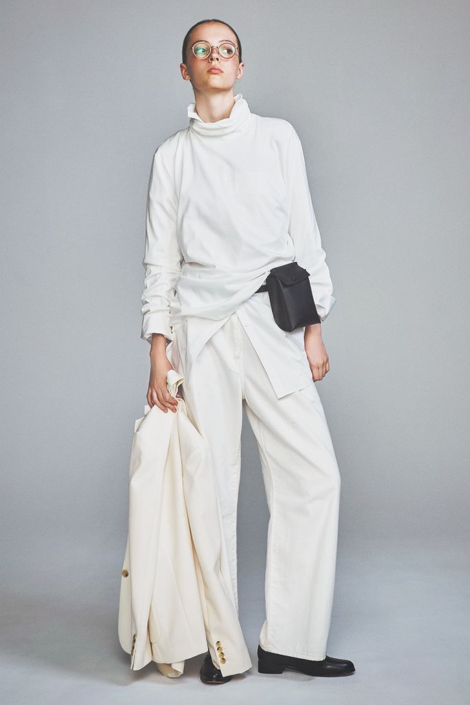 白タートルネックトップス/SLOANE(ザ ショップ スローン 新静岡セノバ店) 白デニムパンツ/TICCA 白ビッグシャツ/ENFÖLD 手に持った白ジャケット/LACOSTE(ラコステお客様センター) 眼鏡/プロポ(プロポデザイン) 黒ウエストポーチ/マロウ(プレインピープル青山) ローファー/A de Vivre