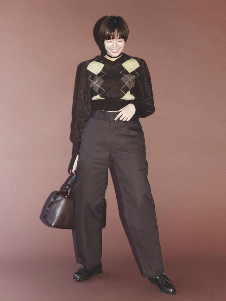ディッキーズ定番の「original 874 ワークパンツ」は、今季のトレンドカラーでもあるダークブラウンをセレクト。ショート丈のニットを合わせて、タイトなウエストバンドを見せると、コーデにメリハリが出てバランスよし!
