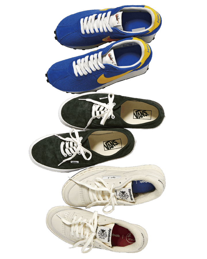 上から:スニーカー¥14,630(ナイキ スポーツウェア/NIKE カスタマーサービス)、スニーカー¥8,250(ヴァンズ/VANS JAPAN カスタマーサポート)、スニーカー¥36,300(アニエスベー・12月上旬発売予定)