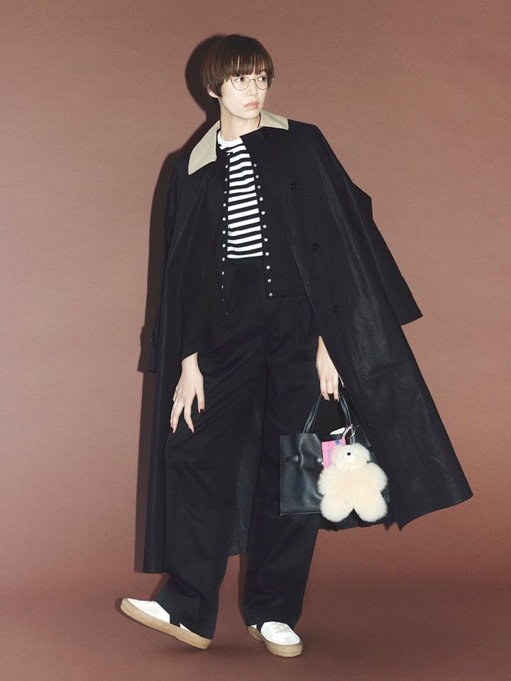 パンツ¥20,900(ザ シンゾーン/シンゾーン 表参道本店)、コート¥159,500(マッキントッシュ/マッキントッシュ 六本木ヒルズ店)、カーディガン¥25,300、ボーダーTシャツ¥14,300(共にアニエスベー)、メガネ¥54,780(オリバーピープルズ/ルックスオティカジャパン カスタマーサービス)、バッグ¥31,900(ヴィオラドーロ)、バッグに付けたポーチ¥2,200(ドリフター/共にル タロン 有楽町マルイ店)、バッグに付けたアニマルチャーム¥5,940(コージー/ル タロン グリーズ ルミネ新宿店)、スニーカー¥35,200(グラフペーパー/グラフペーパー 東京)