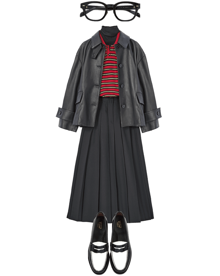 レザージャケット¥217,800(マッキントッシュ/マッキントッシュ 六本木ヒルズ店)、ポロニット¥30,800(キャバン/キャバン 丸の内店)、中に着たタートルネックニット¥51,700(シックススリーナインセブン/S&T)、スカート¥26,400(ジャーナル スタンダード レサージュ/ジャーナル スタンダード レサージュ 銀座店)、メガネ¥19,800(ザ ベッドフォード ホテル/キングスター)、ローファー¥34,100(ジーエイチバス/ジーエイチバス トウキョウ)