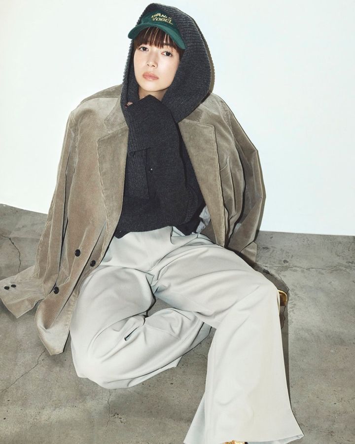 パンツ¥38,500(ジーヴィージーヴィー/grapevine by k3)、ジャケット¥58,300、スカート¥24,200(共にジャーナル スタンダード レサージュ/ジャーナル スタンダード レサージュ 銀座店)、Tシャツ¥18,700(エイトン/エイトン青山)、肩に掛けたスエット※参考商品(ユナイテッドアスレ/キャブ)、キャップ¥3,960(シテン/ユナイテッドアローズ カスタマーサービスデスク)、シューズ¥31,500(トゥティエ)