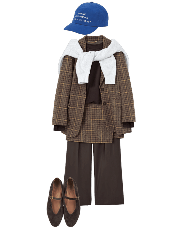 ジャケット※メンズ¥68,200、パンツ¥46,200(共にグラフペーパー/グラフペーパー 東京)、カーディガン¥41,800(ジェーン スミス/ジョン メイソン スミス ジェーン スミス ストア)、フーディストール¥22,000(ハイク/ボウルズ)、キャップ¥8,250(ザ シンゾーン/シンゾーン 表参道本店)、ブーツ¥89,100(ペリーコ/アマン)