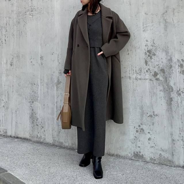 ロングコートを羽織るだけでコーデの縦長シルエットを強調して、スッキリ見え。このときコートより長い丈のワンピースを選ぶと立体感が生まれ、レイヤードがのっぺり見えません。