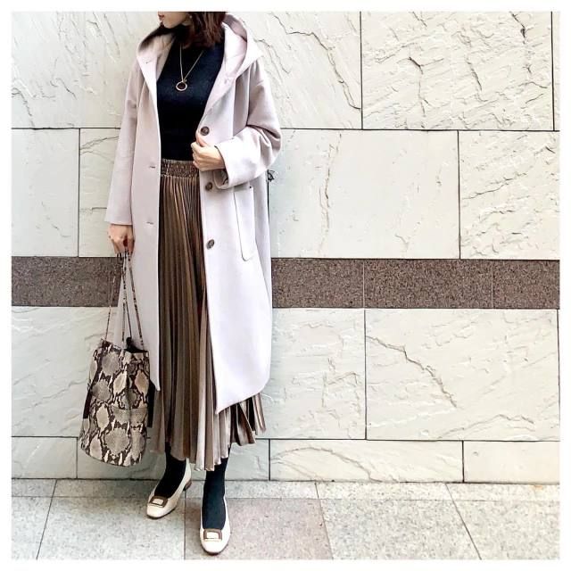 ロングコートに合わせるスカートは「ロング丈のタイトスカート・プリーツスカート」がおすすめ。これらのスカートは裾まわりが広がりにくいため、ロングコートの中で収まりやすく全身のバランスが整います。またクリーンなスカートと大人っぽいコートの合わせ技で女性らしく決まるメリットもアリ。
