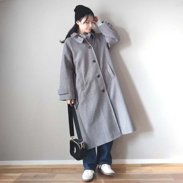 ロングコートの普段使いに最適なのが「デニムパンツ」。加えてスニーカーを合わせるとデニムパンツとテイストが揃い、大人カジュアルな装いに。お出かけ感のあるロングコートを気軽に着こなせますよ。