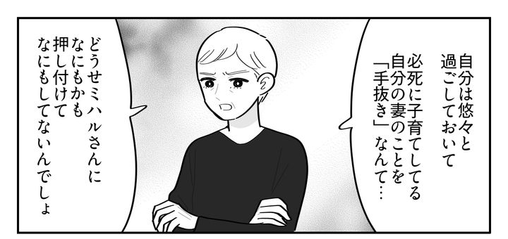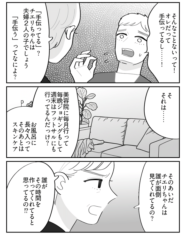 私はミハル。夫のトモヤと半年前に生まれた娘のチエリと暮らしています。トモヤは毎日の肌の手入れやワークアウトなど、いわゆる自分磨きが大好きです。私は美容院に行くどころか、ゆっくりお風呂に入ることすらできないのに……。そんなある日、遠方に住む義両親が訪ねてきました。相変わらず身ぎれいにしているトモヤと、ボサボサの髪で疲れきっている私。義母はそんな様子を見かね、私をかばってトモヤのことを叱りつけてくれました。