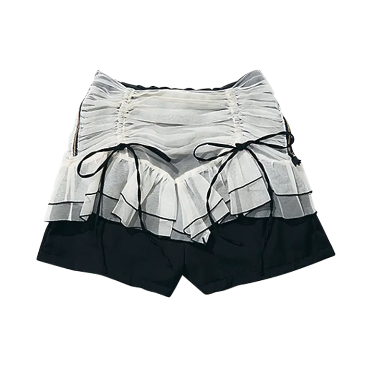チュールとリボンのディテールが目を引くショートパンツ。ゆったりとしたトップスの下からチュールをのぞかせるのが上級者テク。
