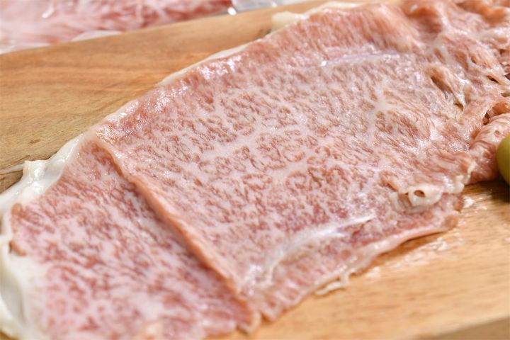 極薄にスライスされた霜降りの美しさは、もはや高級ステーキそのものです。