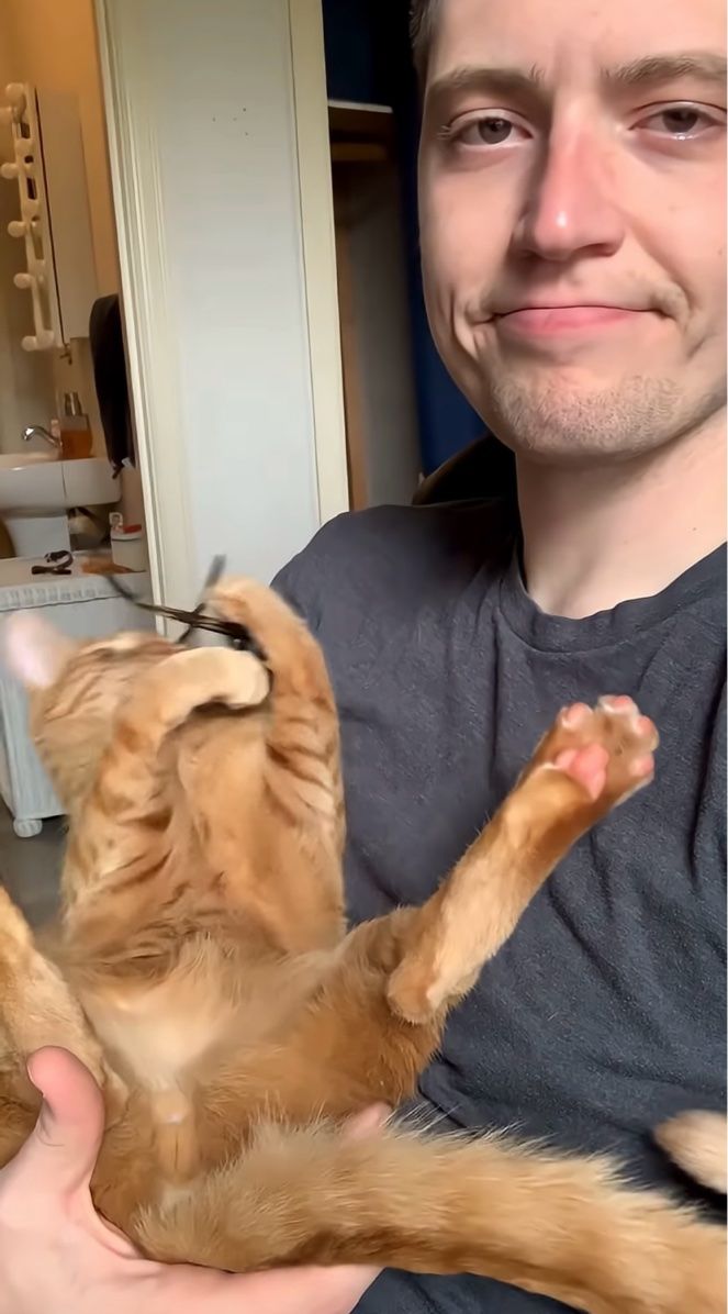 3. パパさんにおててを伸ばすネコ。その目当ては・・メガネ!【アメリカ・動画】