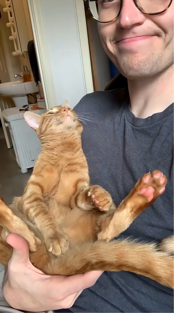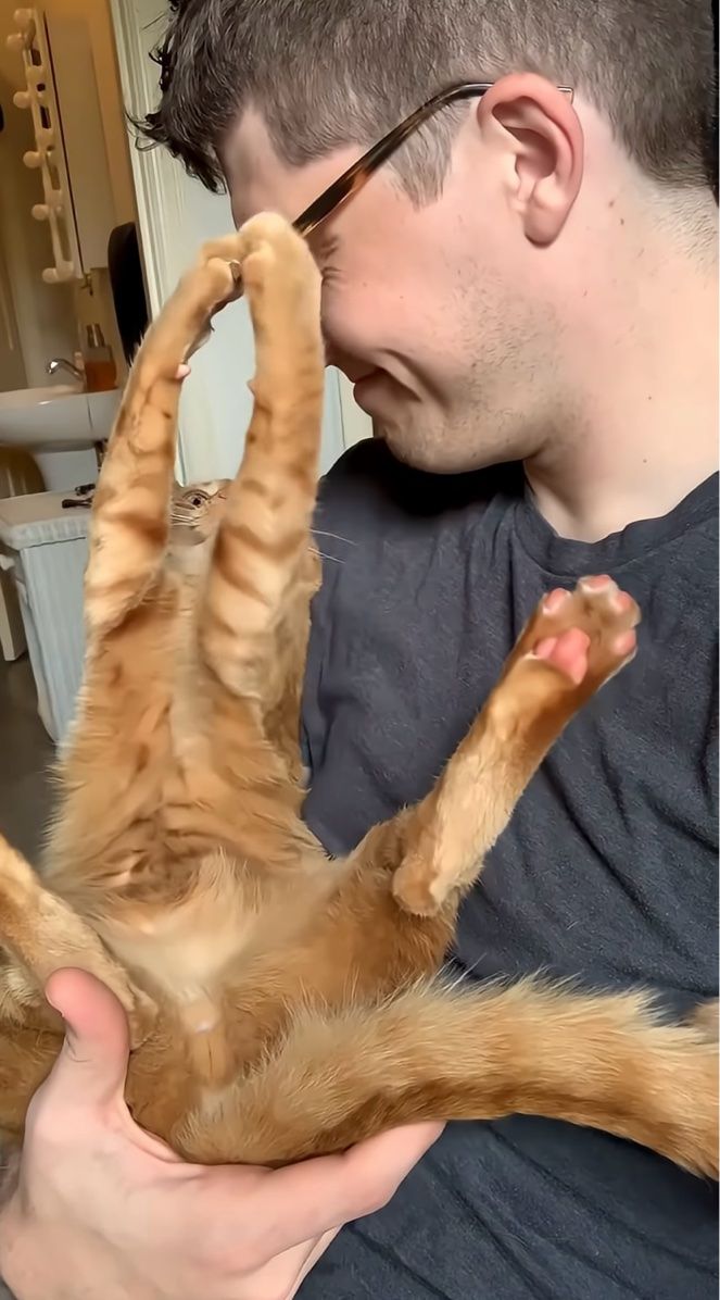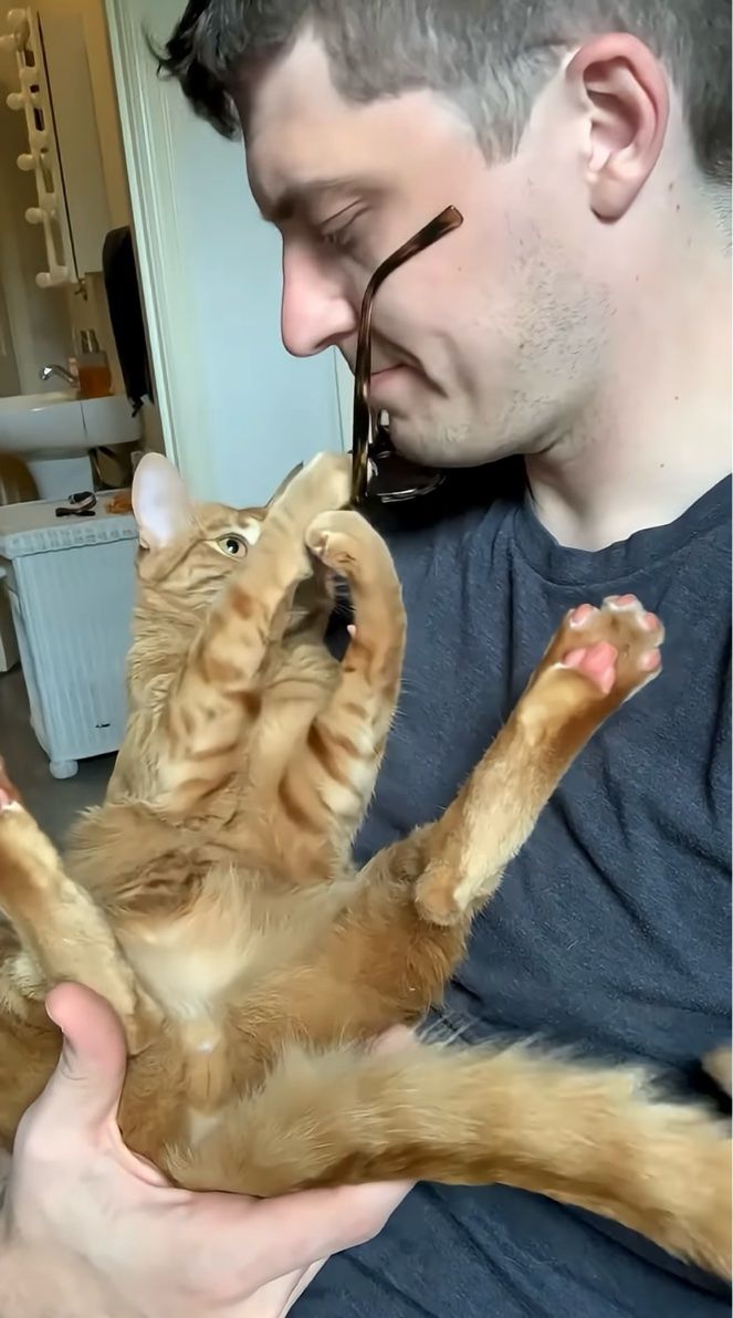 パパさんにおててを伸ばすネコ。その目当ては・・メガネ!【アメリカ・動画】