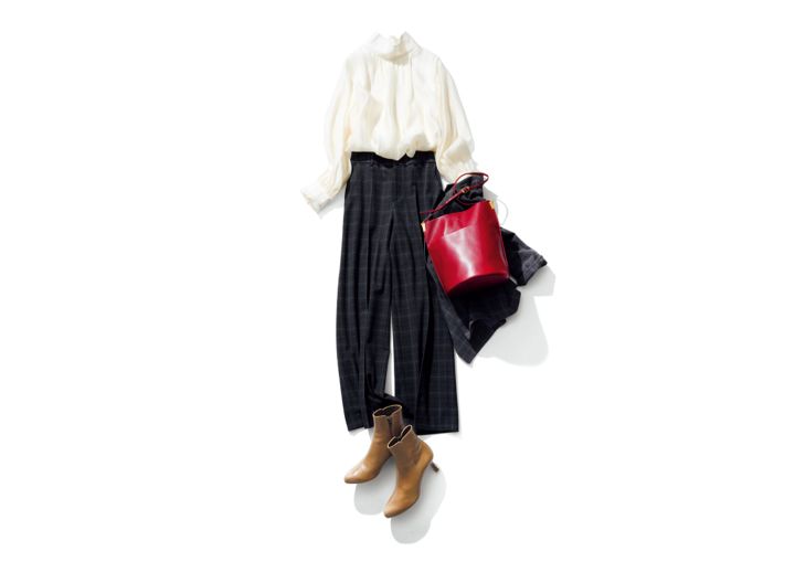 ボウタイブラウス¥19,800/Stola. ジャケット¥17,990、パンツ¥9,990/ともにANYSIS(オンワード樫山) ショルダーバッグ¥6,490/カシュカシュ(アンビリオン) ショートブーツ¥31,900/ダイアナ(ダイアナ 銀座本店)