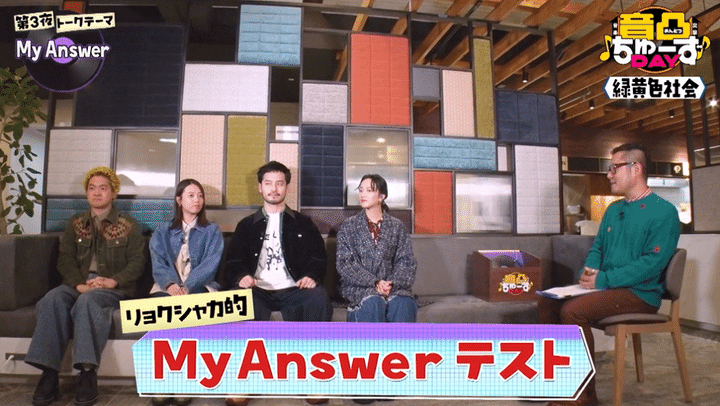 ここで下埜は「リョクシャカ的My Answerテスト」を実施! 4人全員のAnswer(答え)が揃ったら成功!というQ&Aコーナーで、それぞれが答えをフリップに書いて同時にカメラの前でオープンします!