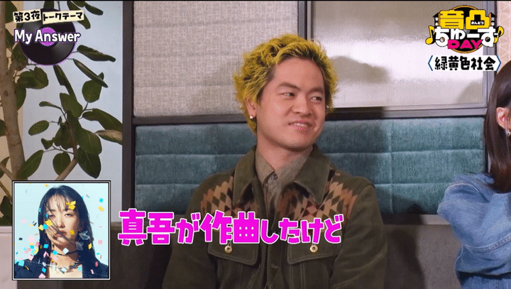 続いてpeppeさんが“ちゅーず”したトークテーマは「My Answer」。穴見さんがドラマのために作曲したこの楽曲を、「メロディーだけの時点ですごくいい曲だった」と長屋さん。他のメンバーも曲を作っていた中で「これは負けた」と、満場一致で採用が決まったそう。