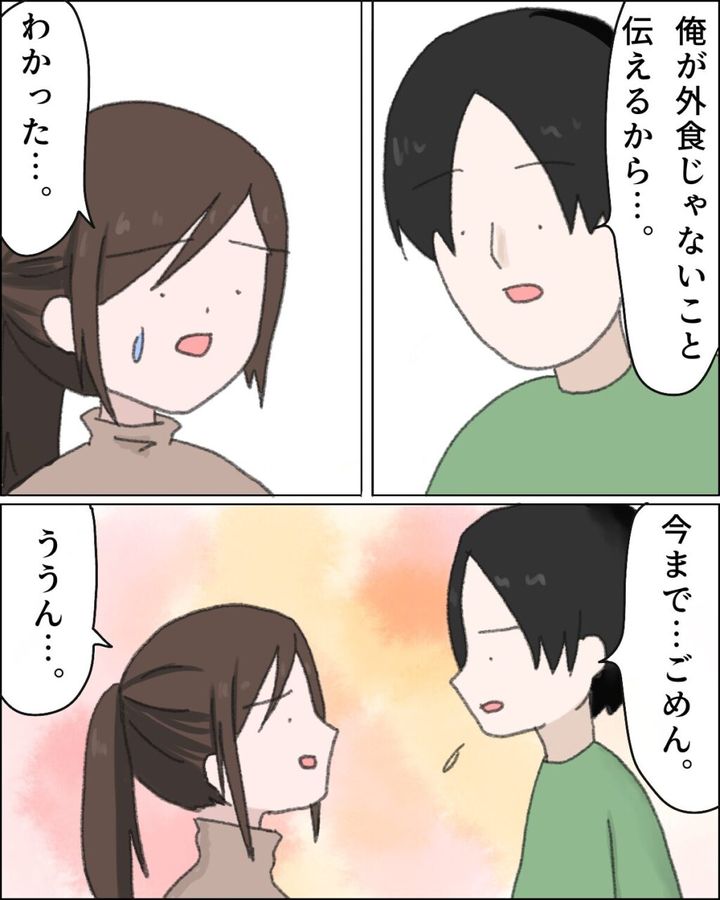 「俺が外食じゃないこと伝えるから・・」真剣な表情で話すヒロユキを見て、「わかった・・」と答えると、「今まで・・ごめん」とヒロユキ、私は「ううん・・」と答えながら、