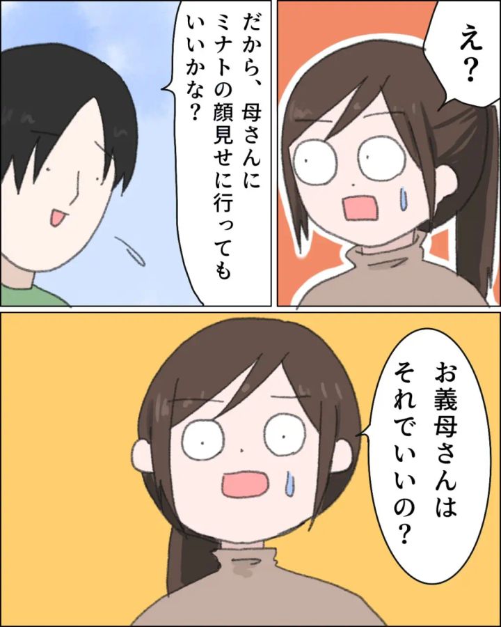 「え?」とまたまたビックリ。すると、「だから、母さんにミナトの顔見せに行ってもいいかな?」ヒロユキの言葉を聞いて「お義母さんはそれでいいの?」とたずねると、