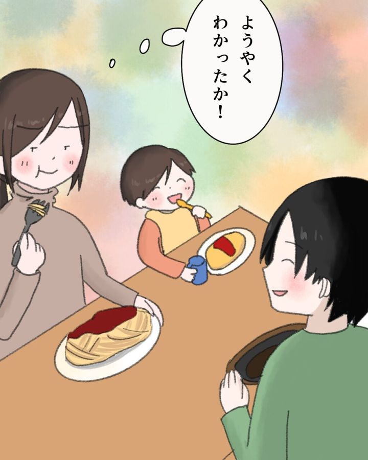 アキナさんの悩みは、一緒に外食に行ったときに義母がいつも何も注文しないこと。飲食店では人数分注文をするのが普通だと思っているアキナさんは、お店側に配慮して注文しない義母の代わりにデザートと飲み物を追加注文。注文しなくても問題ないと思っている夫ヒロユキさんは「母さんの奢りだからってがめつい」と批判しました。ある日、アキナさんが思い切ってマナー違反で恥ずかしいと伝えるとヒロユキさんは憤慨。その後一人で実家に帰省したヒロユキさんがアキナさんが言ったことを不満げに漏らすと義母はヒロユキさんに同調。でも子どもと一緒に帰省していた義妹マリさんはアキナさんの考えに共感。「食べたくないならお店に行かなければいい」ときっぱり言うと、高校生のときに友達が指摘してくれ自分の家族が非常識だったと認識したと話しましたが、義母とヒロユキさんは納得のいかない様子。マリさんはアキナさんに同情し「お兄ちゃんと結婚してお義姉さんがかわいそう」とヒロユキさんに忠告。帰宅後、ヒロユキさんがアキナさんに話すも「ルールがあるなら1人1品頼んでと書いておけばいい」とブツブツ。そんなヒロユキさんに、「ご遠慮くださいとかお控えくださいってどういう意味か分かる?」と問いかけ、自分都合の解釈という点では同じと話した後、「私の気持ちが伝わらないなら外食は控えたい。ミナトにその考えを持って欲しくない」と言い、ヒロユキさんは呆然としました。その後、アキナさんがマリさんにお礼のメッセージを送ると、レストランでオーダーしない義母に「おひとり様1品ご注文お願いします」と店員さんが言い、義母が怒り出す前にヒロユキさんがオーダーしたと話しました。