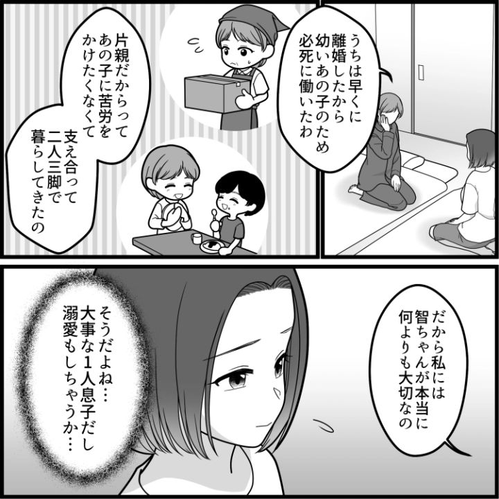 彼氏の智也と同棲を始めるため、彼の実家へ行き、お母さんに挨拶することになった真希。しかし、実家へ着いた途端、いきなり真希の目の前で、智也とお母さんが熱いハグをする。想像にもしなかった行動に驚く真希だったが、さらに母親が智也に「あーんして」と要求している所を見せつけられる。初めて見る智也の一面に引いてしまう真希だったが、さらにドン引きするような出来事が発生することに!?