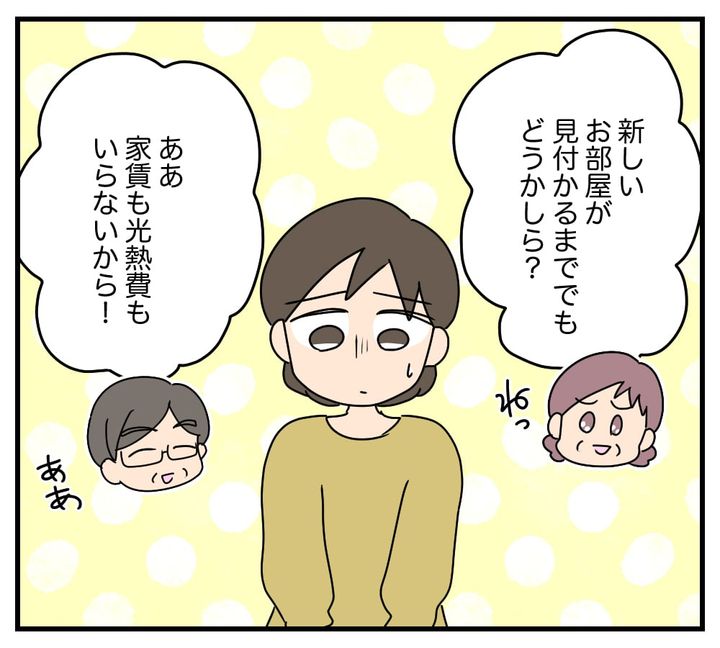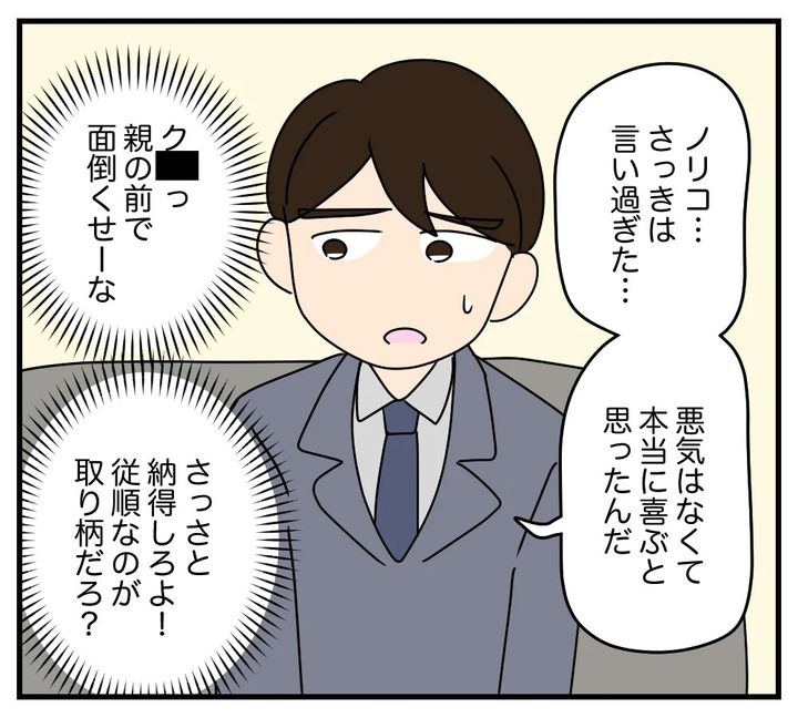 事情を説明すると、義父は「マナブから言ってきたことだったのに、まさかノリコちゃんに黙っていたとは!」とショックを受け、義母は「私たちと同居するなんて嫌よね?」と泣き出す。