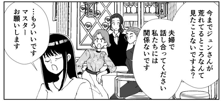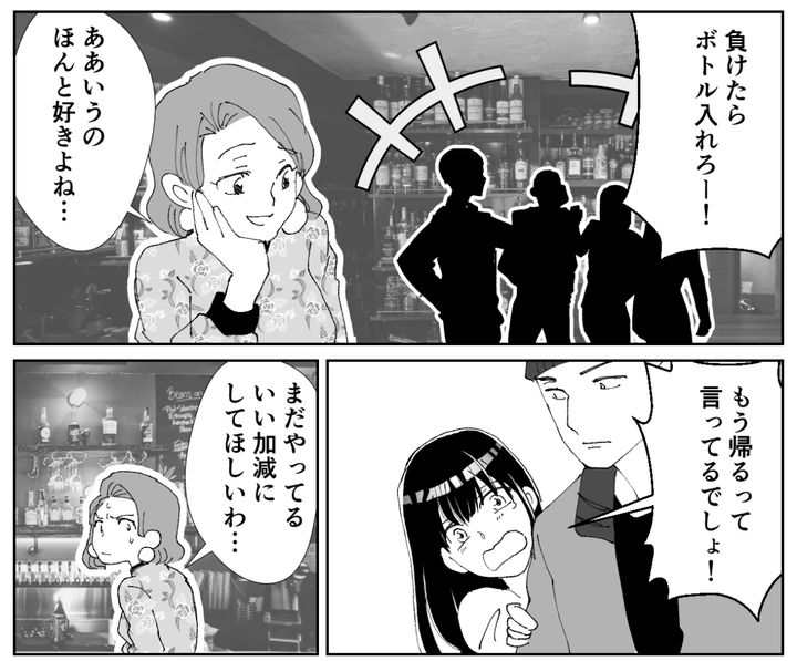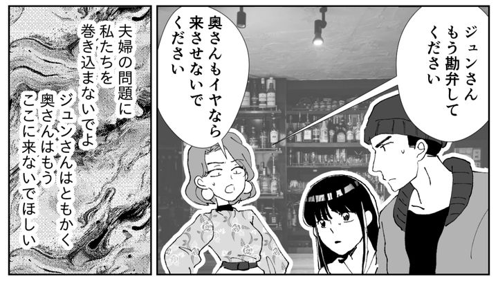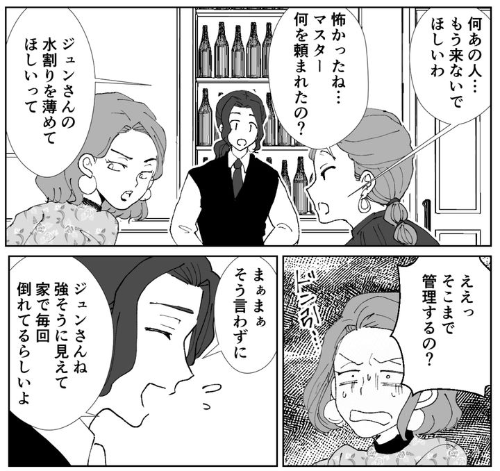 奥さんはマスターに何かを頼んだようでした。聞くと、ジュンさんの水割りを薄めてほしいとのこと……。そこまで管理するの? と私はドン引きしてしまいました。