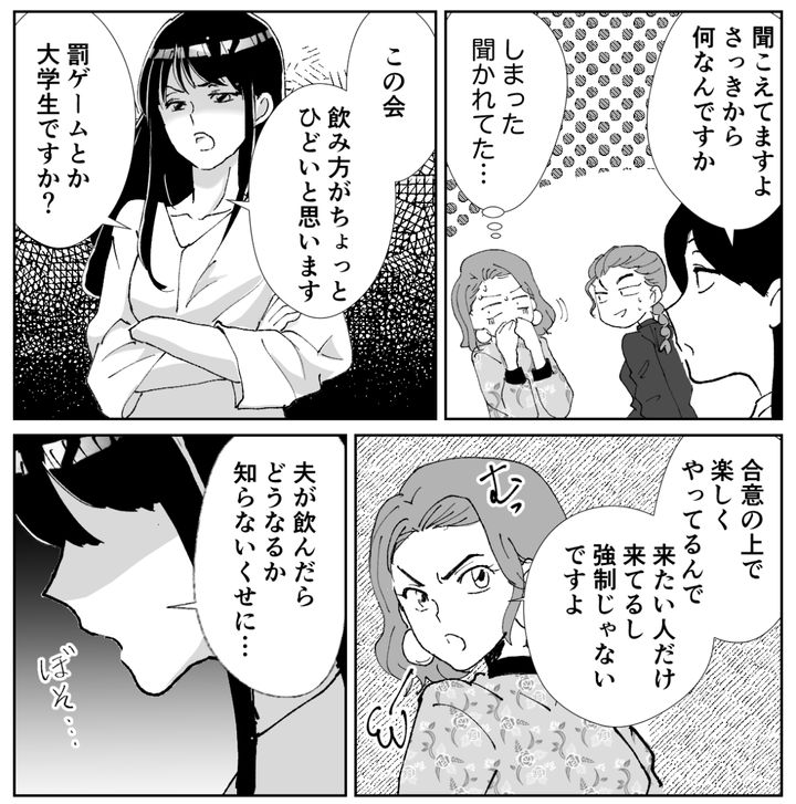 愚痴が聞こえた奥さんは、「この会飲み方がちょっとひどいと思います」と言ってきました。
