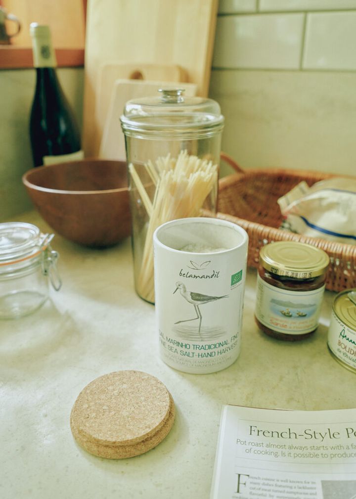 「料理に欠かせない塩こそ、いいものを使いたい」と選んだ〈ネクトン〉の「トラディショナル・シーソルト」。ポルトガル・オリャオンの自然保護区、リア・フォルモーザ自然公園内の塩田で採塩し、太陽と風の力だけで蒸発させて作られた天日塩だ。火入れせずに仕上げるため、マグネシウムやカリウム、カルシウムといった海水に含まれるミネラルが損なわれず、栄養豊富。さらさらと溶けやすく、あらゆる料理に使いやすい。400g¥1,188(メルカード・ポルトガル 鎌倉大町店 0467−60−5002) その他スタイリスト私物