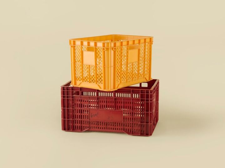 コンテナ感がなんとも言えない素朴なプラスチックの収穫かごは、現代の製品です。上は皆さんご存知の日本のもので、下はブラジルに行った際に緩衝材を兼ねて買ったものです。軽くて頑丈で、積み重ねもできるため、収納グッズとしての機能も併せ持つのです。日本のものは陶器の窯から作品を持ち帰るときにそのままいただいたもので、とても効率よく運ぶことができたのが、今でも忘れられません。国が変わればサイズやプラスチックの色味も変わり、そんな違いがまた楽しいのです。