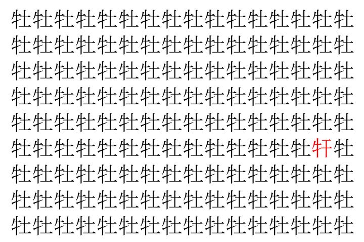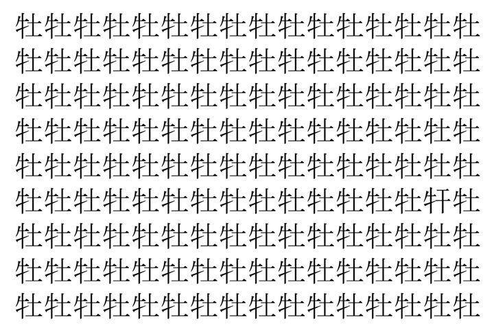 画像の中には、「牡」という漢字が縦に9行、横に16個並んでいます。 全部で144個となりますが・・・、そのうち1つは「異なる漢字」となってますよ!!
