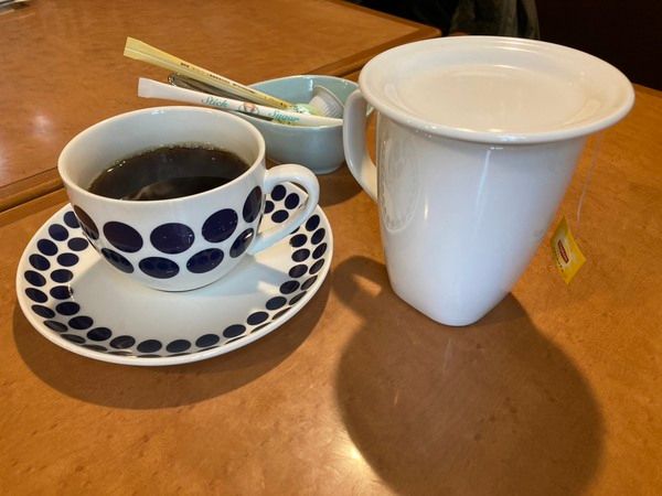ホットコーヒーと紅茶。レトロなドット柄のカップも嬉しい