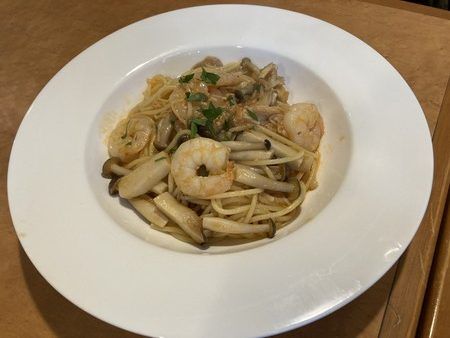 しばらくして出来立てのパスタが。大きくてプリッとしたエビが載っていて、きのこもたくさん♪とても美味しそうでした。