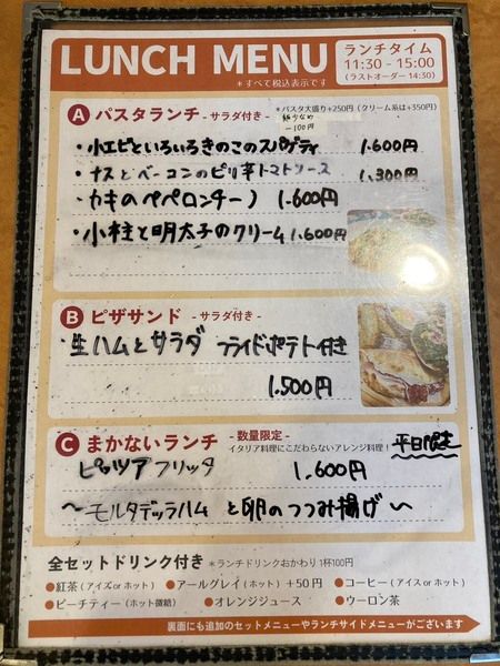 11:30~15:00はお得なランチタイム。パスタやピザサンドにサラダと飲み物が付きます。数量限定の「まかないランチ」も♪