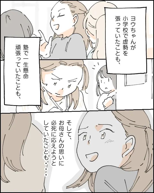 ヨウちゃんが小学校で虚勢を張っていたことも、塾で一生懸命頑張っていたことも、そしてお母さん思いに必死に応えようとしていたことも・・