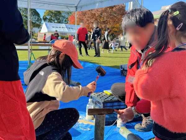 えひめ森林公園ブースでは、木や竹の素材で工作ができました。 写真は、竹で作るガラゴロウォーカーの製作場面。 参加費は無料で、子どもたちがトンカチや鋸を使い、竹の筒を切って作っていました。