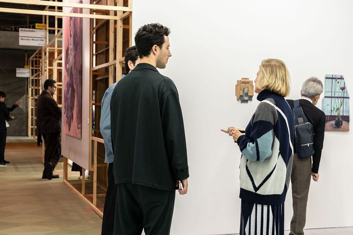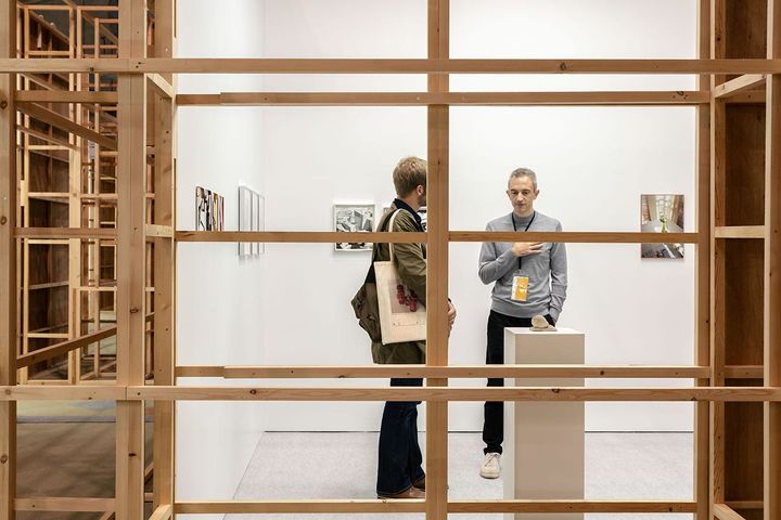 2025年「ACK」会場風景。格子状の木枠によって形づくられたブースは、あえて完全には仕切られず、建設途中を思わせる軽やかな緊張感を残している。視線と動線は木枠を越えて流れ、各ブースはゆるやかに連なり合う。 Courtesy of ACK, photo by Moriya Yuki