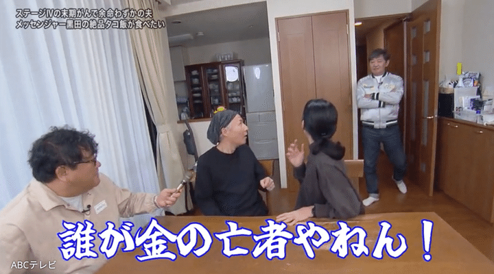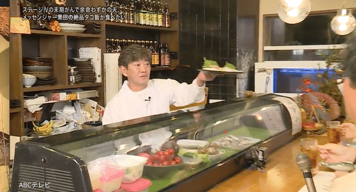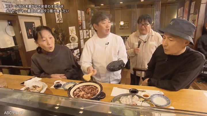 探偵!ナイトスクープ』(ABCテレビ)に、兵庫県在住の女性(56)から「闘病中の夫の夢を叶えていただきたい」という依頼が届く。依頼者の夫は末期の大腸がんで、余命半年とも言われているそうだ。「人生でやり残したこと」を尋ねると、お笑い好きの夫から、メッセンジャー黒田の居酒屋に行けなかったことが心残りだという回答が…! 依頼者は、黒田がテレビで発言した「いつか居酒屋を開きたい」という夢の実現を心待ちにしている夫に、黒田の得意料理「タコ飯」を食べさせてあげたいという。飲食代の予算は、なんと100万円!?