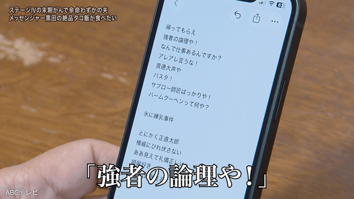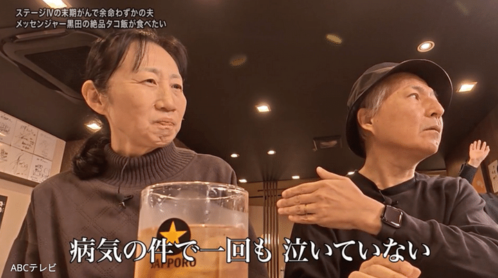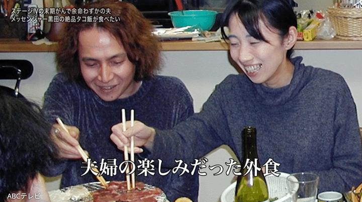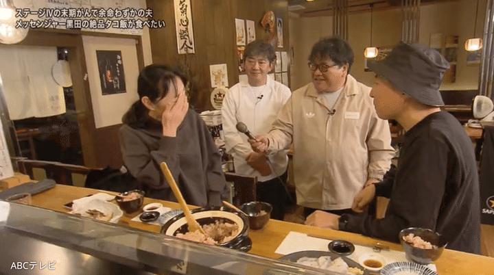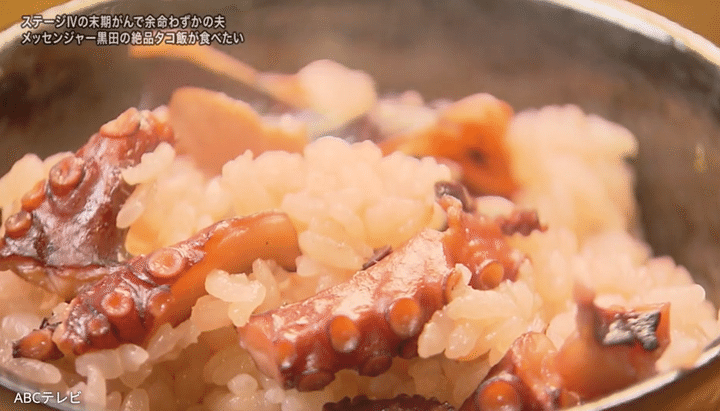 念願のタコ飯を味わい幸せそうな夫を見て、奥様は「胸がいっぱいで…」となかなか言葉がまとまらない。妻の「あと半年かもとか言われたのに、ずっと生きててくれるんじゃないかと思って」「何よりの薬になったと思います」という言葉に、夫が力強く頷いた。