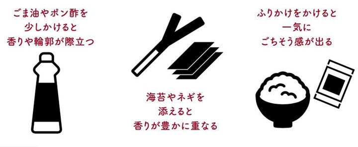 中でもおすすめなのが、ふりかけを組み合わせる方法です。たとえば定番の「のりたま」は甘味・塩味・香りのバランスが絶妙で、卵、魚粉、海苔がそれぞれ役割を担い、ご飯を一気に〝ごちそう〟へと変えてくれます。