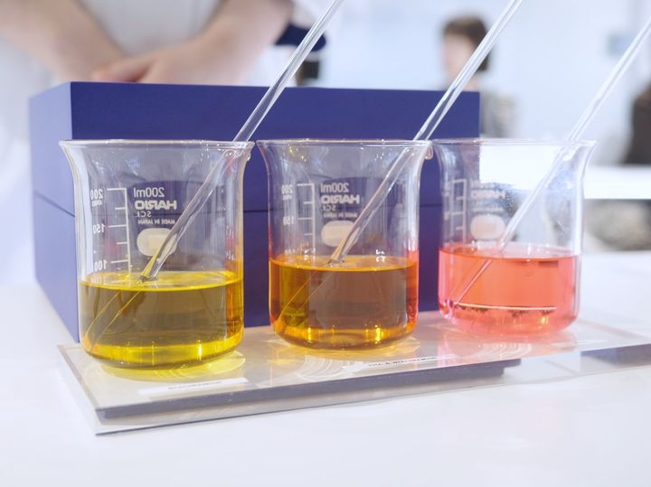 発表会では、PHA(※4)とナイアシンアミドそれぞれと合わせたもののpHを見ることができるデモンストレーションが行われました。PHA(※4)をpH試薬に入れると酸性を示す赤に、ナイアシンアミドはアルカリを示す黄色に変色しました。