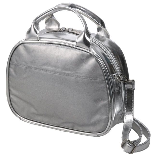 今回のモノクロバージョンは、シルバーのキラキラ生地にミャクミャクもファスナーも金具もすべて真っ黒のクールなデザイン。大きめスマホをラクに出し入れできる外ポケットと、しっかり閉まるメイン収納の2層構造でちょっとしたおでかけはこれひとつで行けちゃいます。