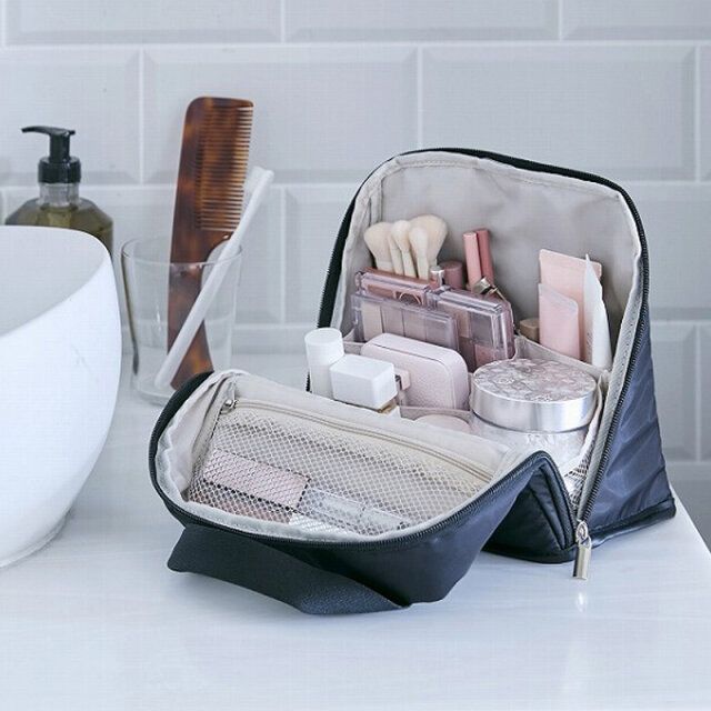 まるでヘアメイクアップアーティストが使っているメイクボックスのような、シンプルで多機能なデザインのポーチは、長いものを立てて収納できたり、メッシュ素材の側面で底のアイテムが見つけやすかったり、ファスナーを開くと前面がバタンと折れて中身がひとめで見られたりと、使いやすいポイントが満載!