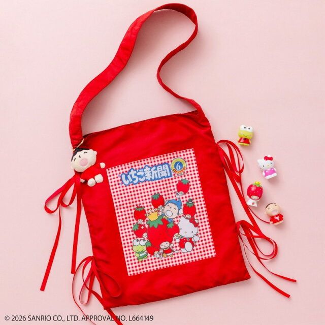 サンリオの月刊紙「いちご新聞」の創刊50周年を記念したムックは、いちごの王さま、ハローキティ、けろけろけろっぴ、みんなのたあ坊がそろった268号の表紙が大きくデザインされたバッグ。